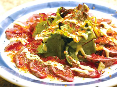 ◆料理:全5品(2,000円コース) 前菜(さつま芋バター・うずらのたまり漬け・秋茄子の煮浸し)、人参サラダをパッチョドレで、万能ネギの肉巻き炙り、本日の鮮魚で薄造り炙り刺し、手羽元と里芋の煮付け(仕入れの都合等により変更の場合あり)